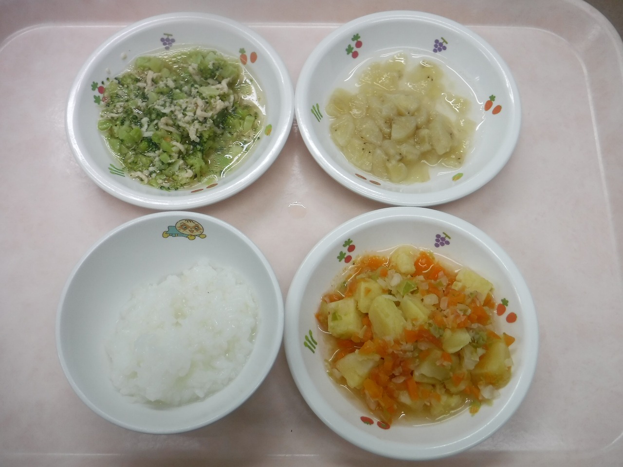 2025年11月13日 今日の給食 離乳食25倍がゆブロッコリーとさつま芋のうま煮野菜のトマト煮煮バナナ 離乳食1なんはんブロッコリーのそぼろ煮野菜とさつまいものうま煮煮バナナ 幼児食ご飯若鶏のケチャップ煮ブロッコリーサラダボイルキャベツトマト