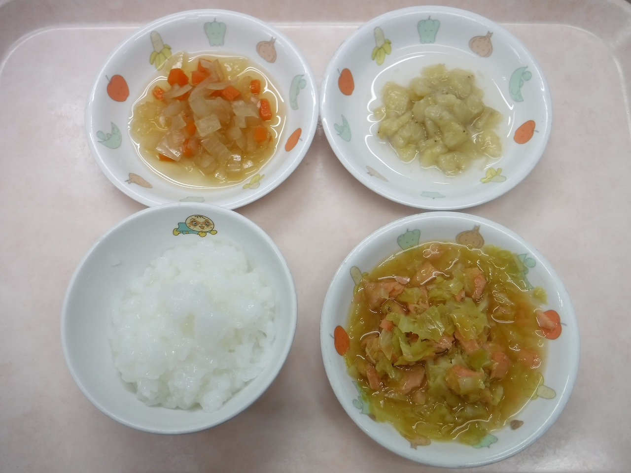 離乳食 5倍がゆ なんはん 鮭とキャベツの炊き合せ 人参と玉葱の煮付け 煮バナナ